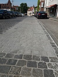 Das Pflaster ist auf der Oberseite glatt gesägt, ist aber an den Seiten rau und zerklüftet, sodass die Steine nicht direkt nebeneinander liegen (wie z.B. am Hallplatz oder auch auf den Parkbuchten direkt neben der Probestrecke), sondern es gibt relativ große Fugen zwischen den Steinen.